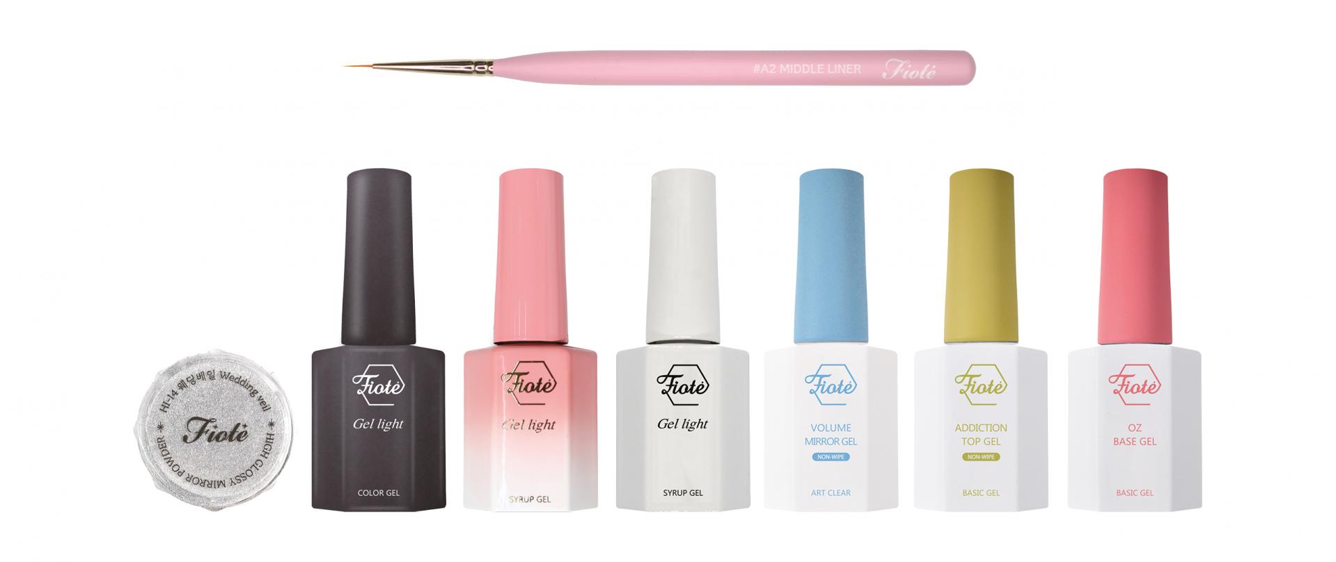 파일, 피오떼 오즈 베이스 젤, 피오떼 어딕션 탑 젤, 피오떼 볼륨 미러 젤, 피오떼 블러 젤, 피오떼 컬러 & 시럽 젤(FP04, IF01, NA09),피오떼 하이 미러 파우더(HI14 웨딩 베일), 피오떼 아티스트 브러시(A2 슬림 라이너), 피오떼 젤 스타터, 수제 파츠(불가사리), LED 램프
