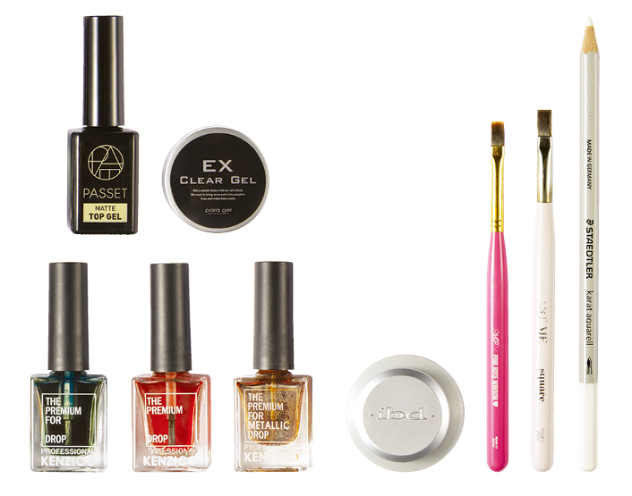 파일, 베이스 젤, 탑 젤, 클리어 젤, 젤 클렌저, 젤 브러시 (미니 스퀘어, 스퀘어), 틴트 컬러(그린, 레드, 메탈릭 골드), 색연필(화이트), LED 램프